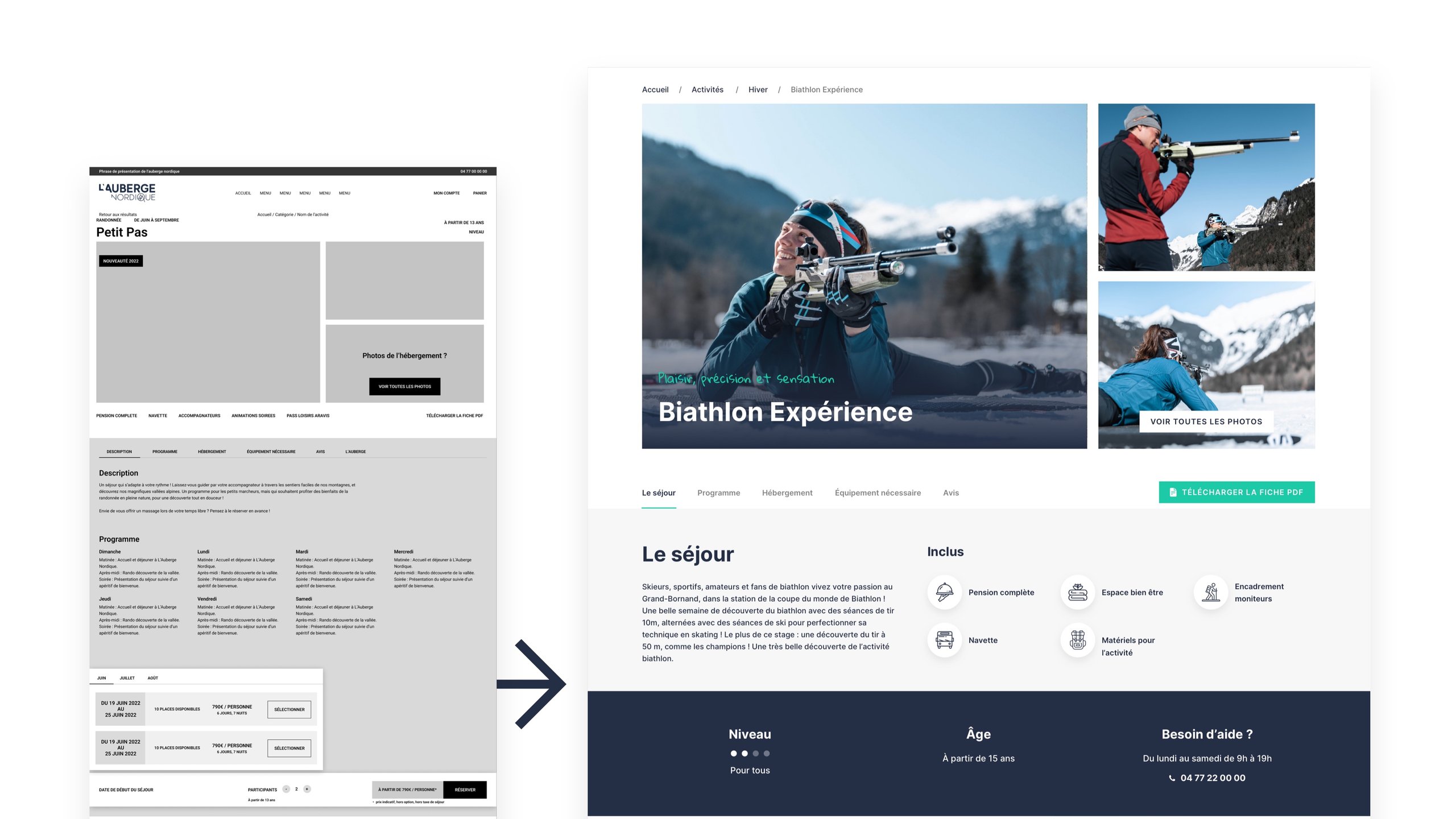 L’équipe de l’agence Nateev a relevé le défi en repensant entièrement le site web de l’Auberge Nordique. Nous avons plongé dans l’univers de l’auberge. La refonte a touché tous les aspects : du design à l’expérience utilisateur, en passant par la facilité de réservation et l’adaptabilité mobile. Nous avons mis en avant le large éventail d’activités proposées, du ski à la randonnée en passant par la relaxation, grâce à un nouveau système de navigation intuitif. Les visiteurs du site peuvent désormais explorer les séjours et se plonger dans la beauté du cadre exceptionnel de l’auberge. Grâce à une mise en page fluide et immersive, les utilisateurs peuvent facilement accéder aux informations nécessaires et réserver leur séjour en quelques clics. En résumé, notre réponse à la demande de l’Auberge Nordique a été une transformation digitale complète, traduisant son héritage montagnard en une expérience en ligne moderne et engageante. Le nouveau site incarne la promesse d’aventures et de plaisir, tout en répondant aux besoins actuels des utilisateurs, et ce dans le but d’attirer un public toujours plus large vers cette escapade au cœur des Alpes.