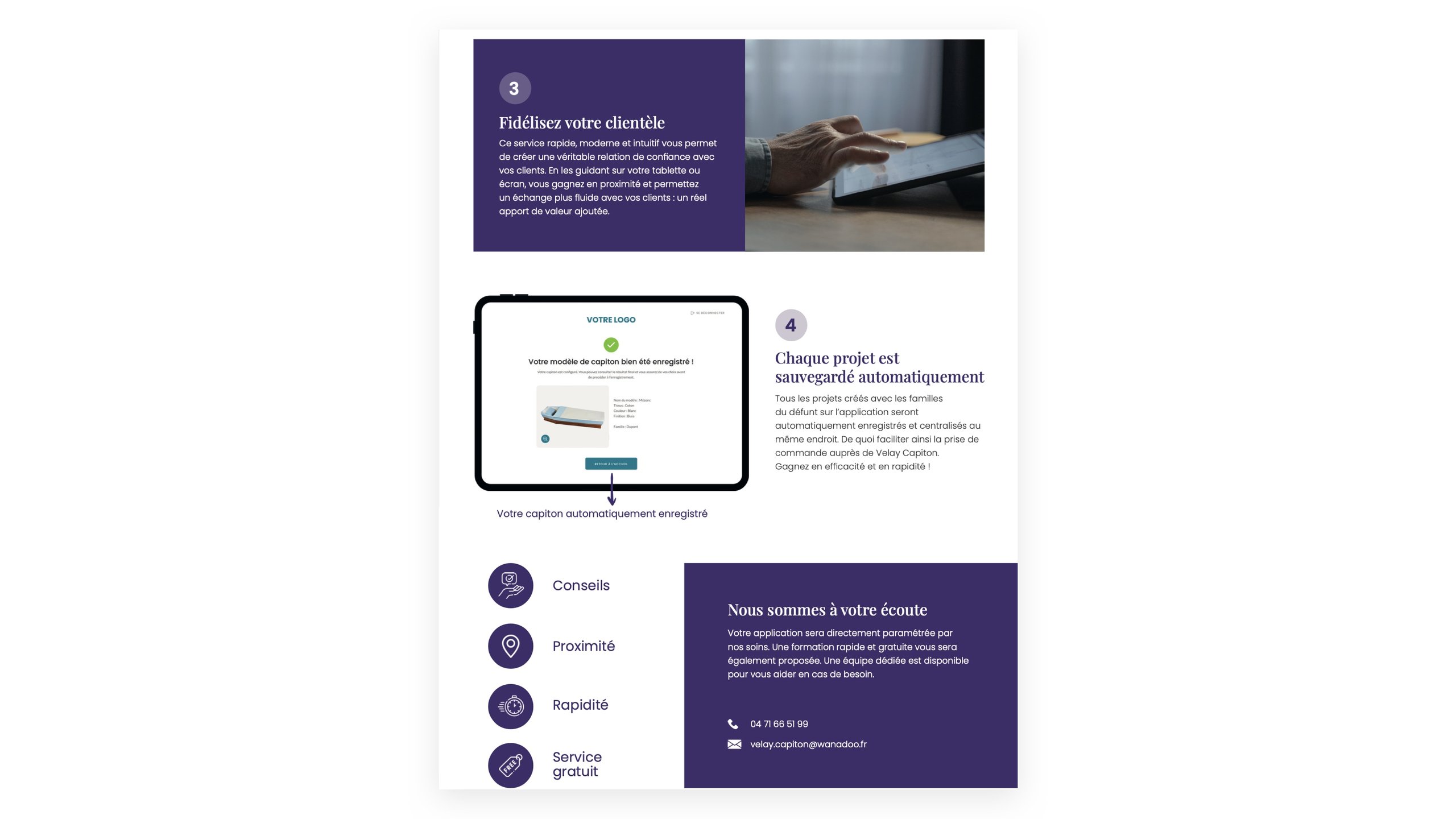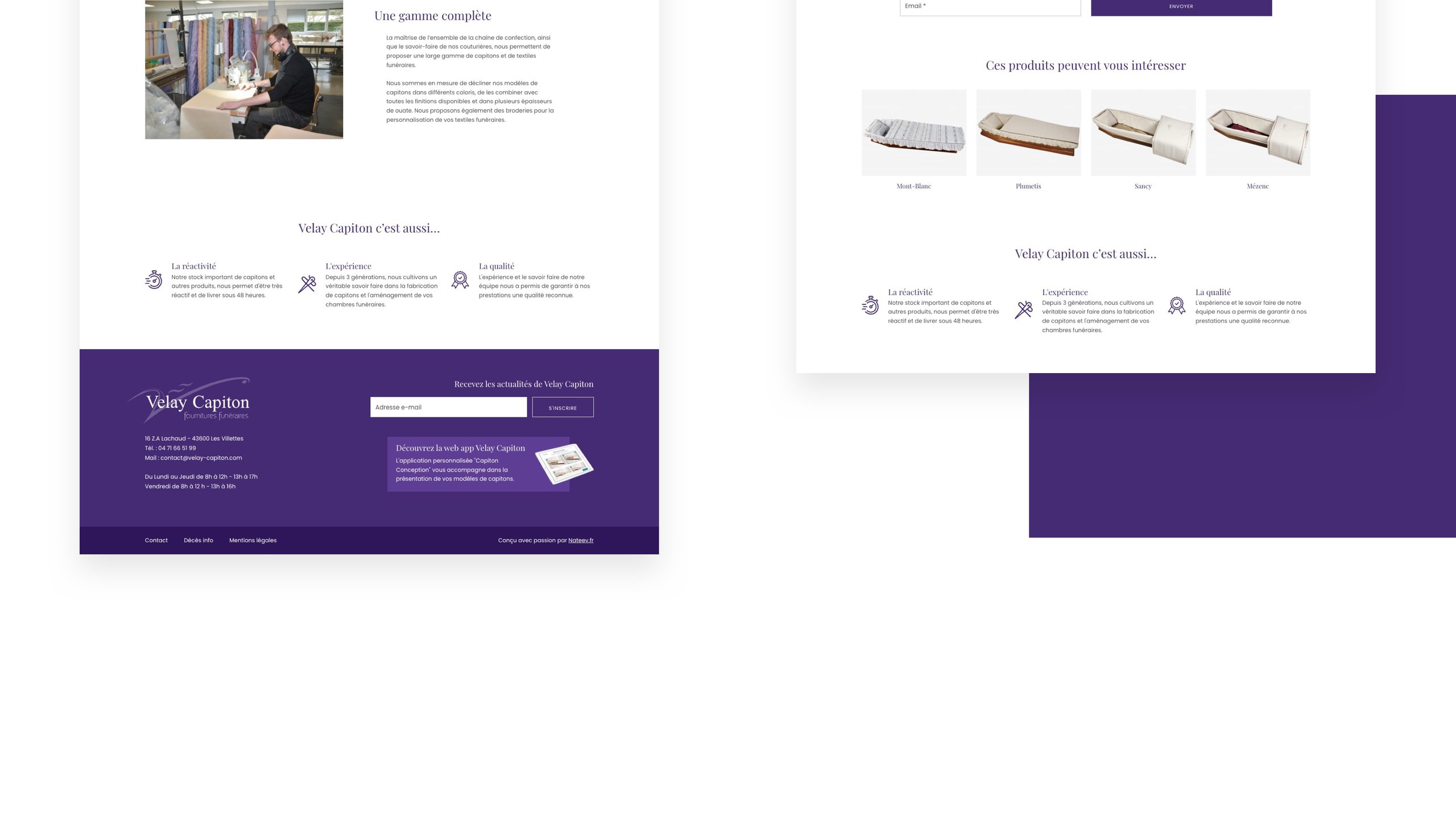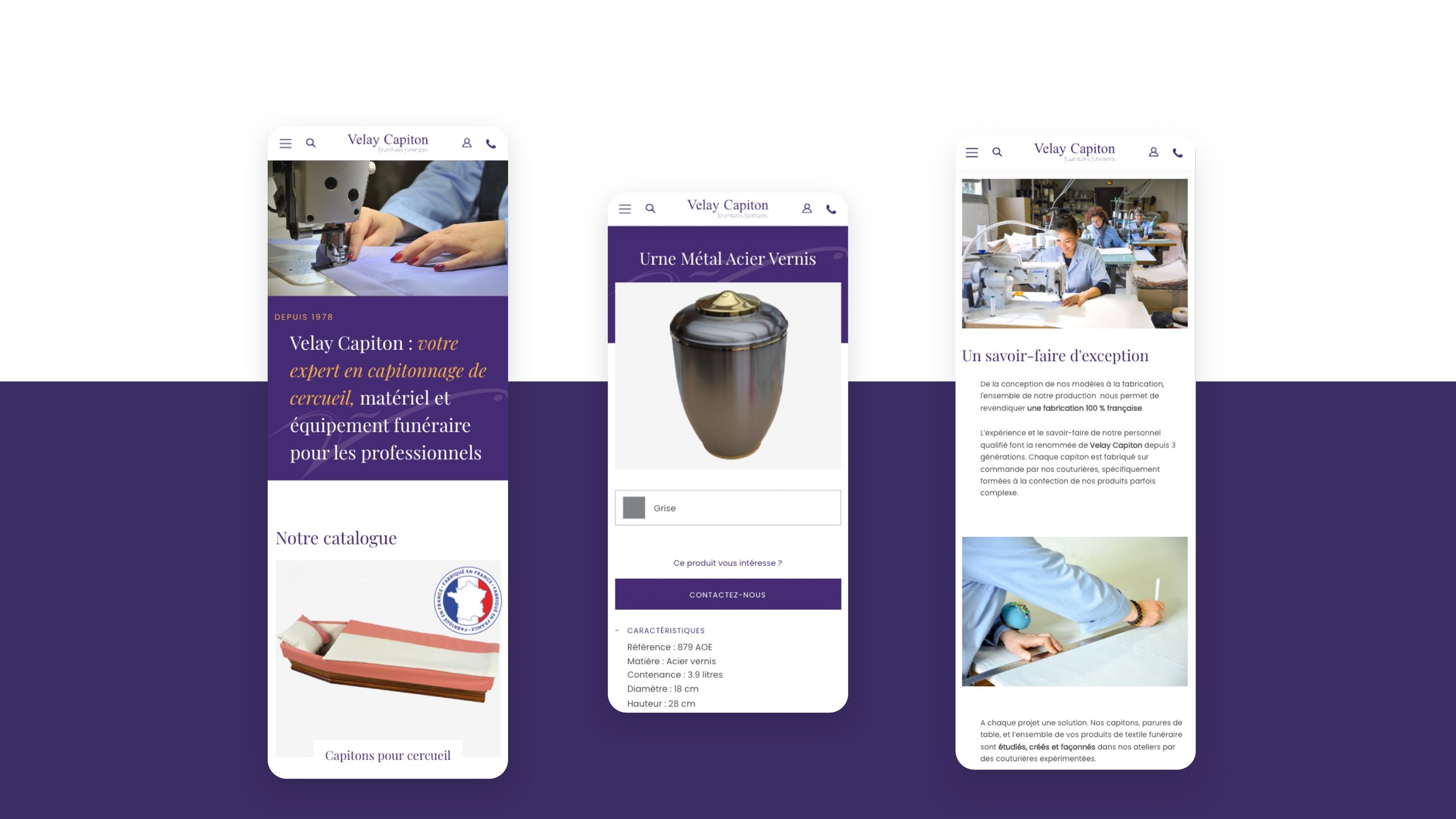 Nateev a conçu pour Velay Capiton un site vitrine B2B sur-mesure, développé avec notre CMS Flow. Le site a été pensé pour offrir une expérience de navigation claire et structurée, avec un catalogue produit organisé par univers : capitons, urnes, articles de cérémonie, textiles, papeterie, équipements professionnels...