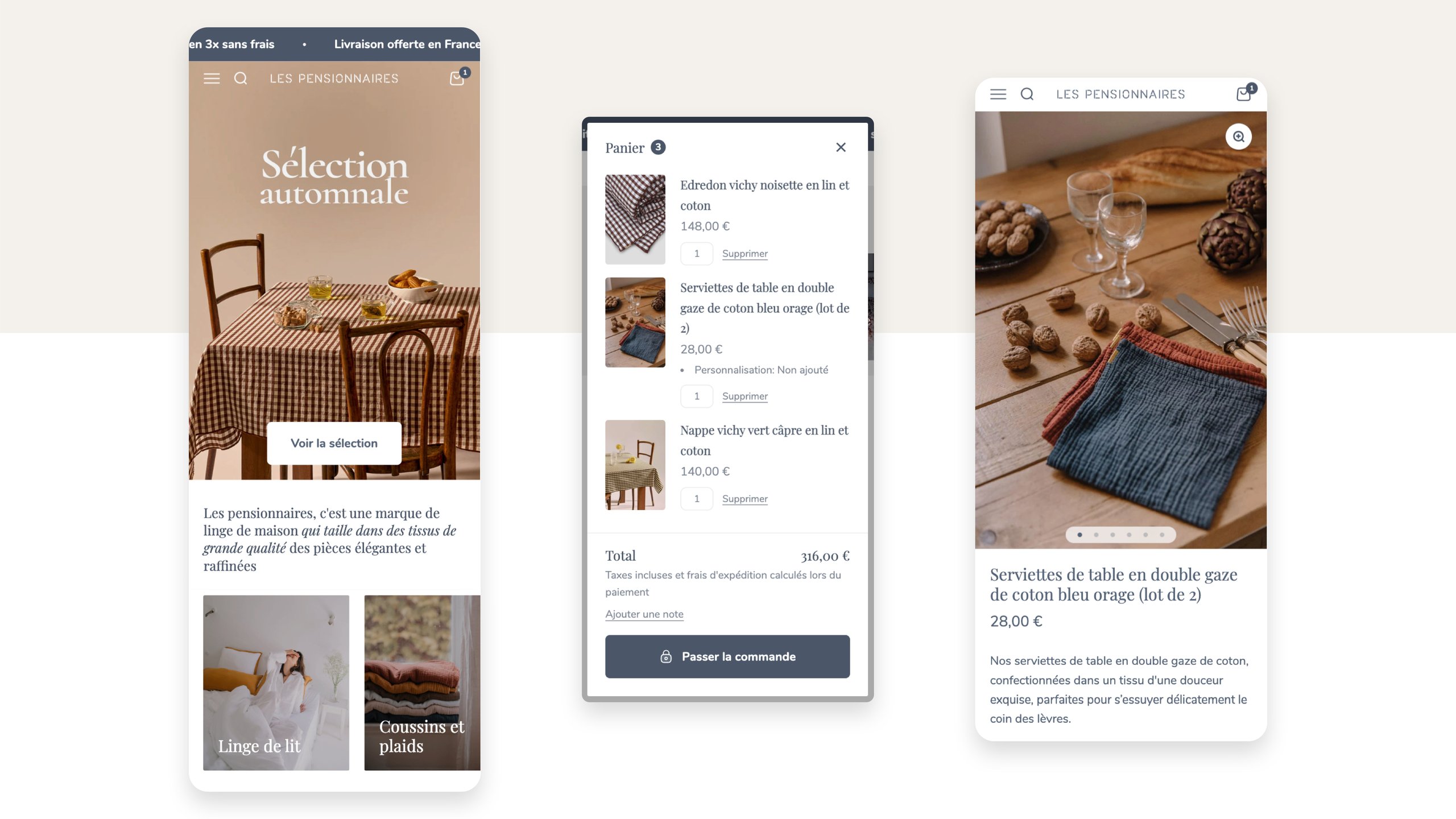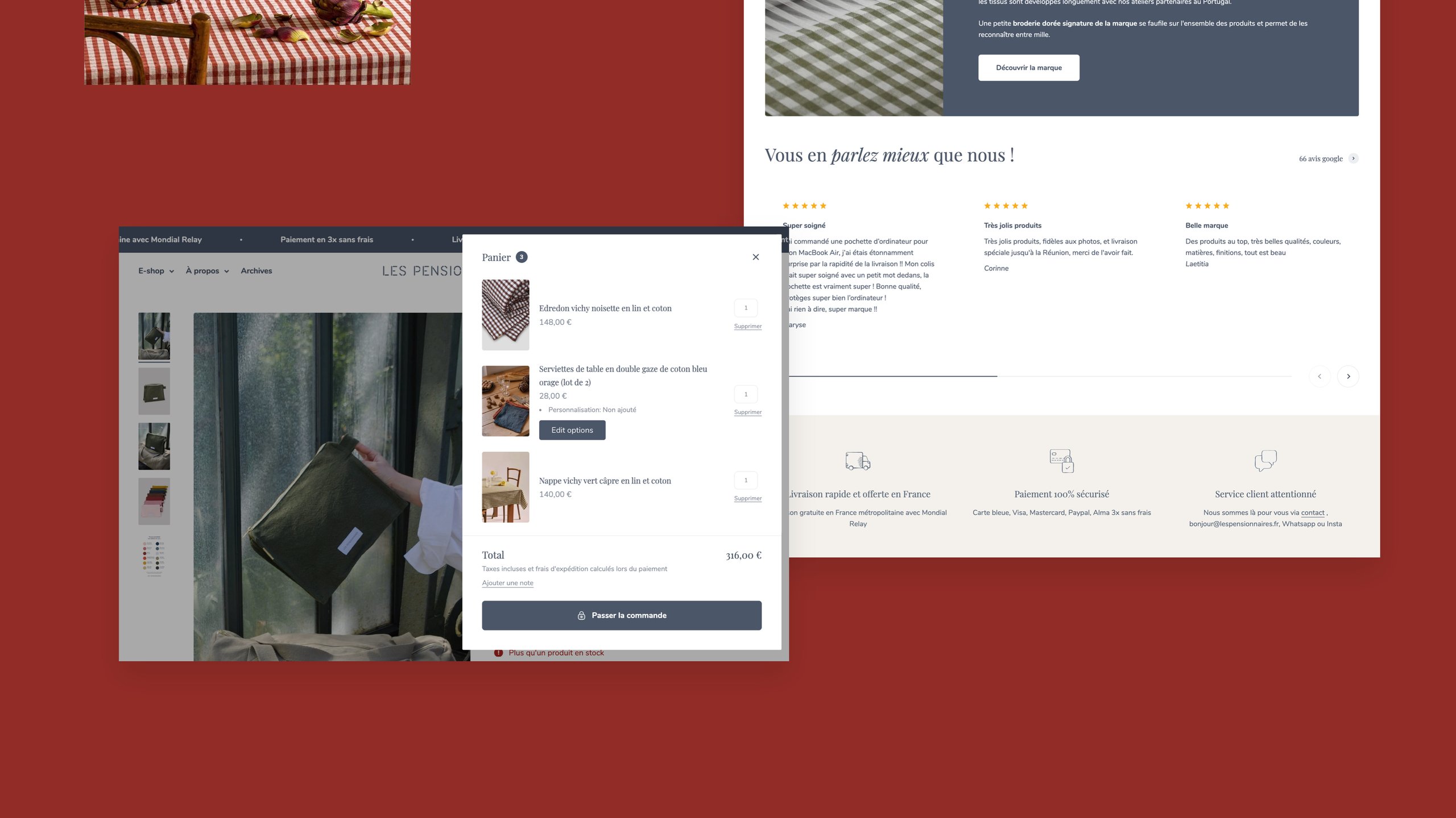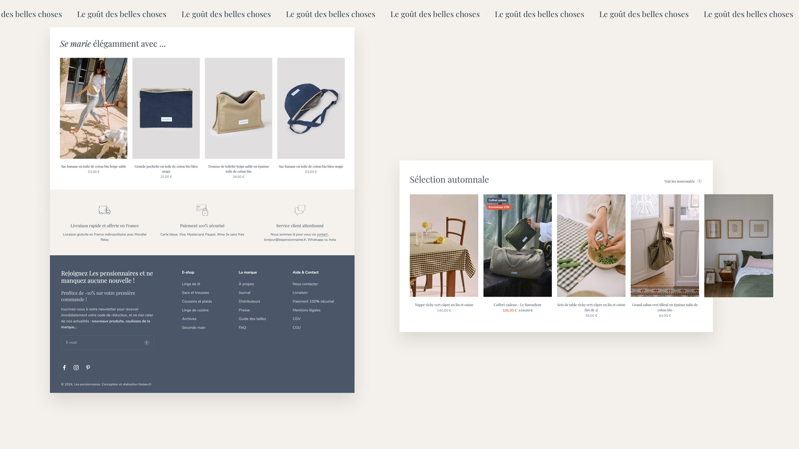 - Développement personnalisé pour renforcer l'identité de la boutique : Des fonctionnalités spécifiques ont été ajoutées pour renforcer l’identité visuelle de la marque et faire en sorte que le site reflète parfaitement l’image élégante et soignée des Pensionnaires.