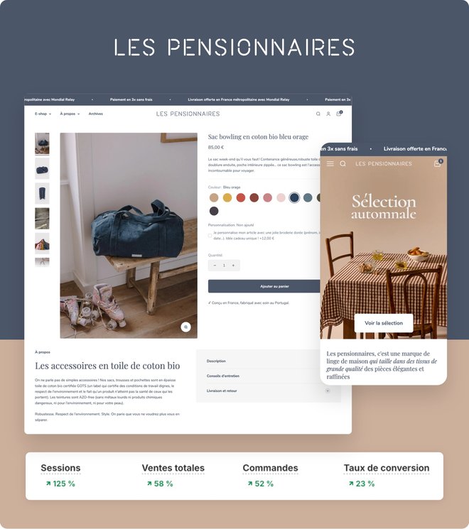 Les Pensionnaires souhaitaient moderniser leur boutique en ligne pour simplifier la gestion des contenus et améliorer l’expérience utilisateur. L’enjeu était également de proposer des fonctionnalités avancées (packs, parures, personnalisation produit) tout en respectant l’identité visuelle élégante de la marque.